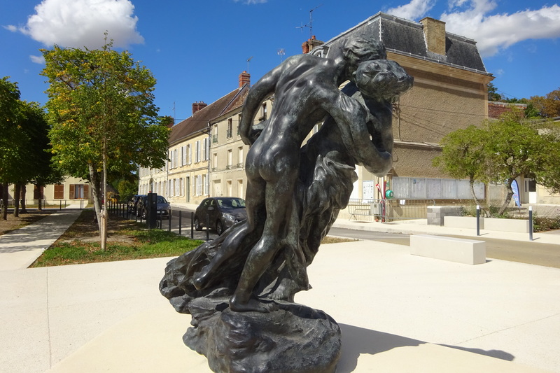 Légende des photos; sculpture de Camille Claudel sur la place de la mairie de Fere en Tardenois, puis le château de la Ferté-Milon et l’Abbaye de Longpont.