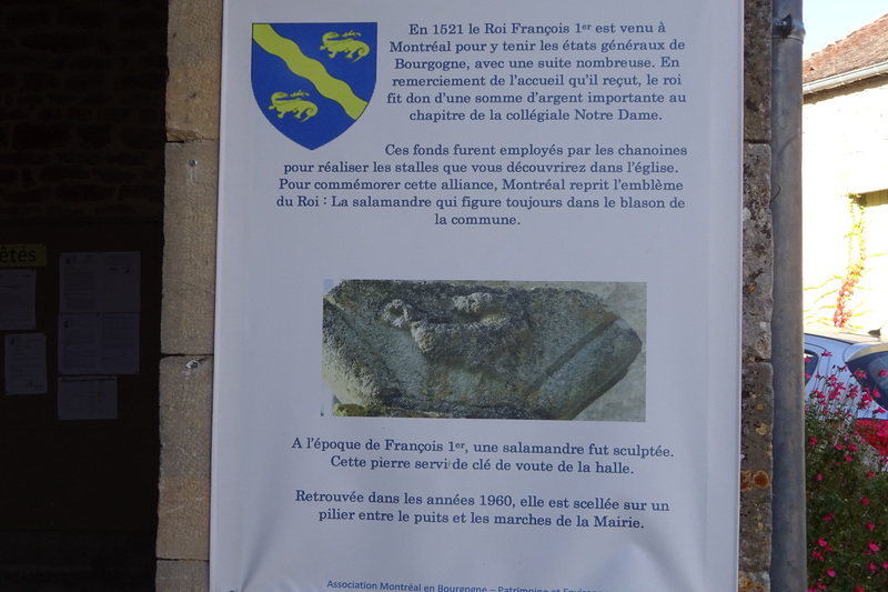 Ayant trouvé logement près d’Avallon, je commence mon périple par Montréal sur Serin village fortifié visité par François 1er qui y fut bien accueilli en 1521 au point de remercier le village par un don important. De son passage, on peut voir encore la salamandre, son emblème sur un mur de la cité. Une collégiale au sommet du bourg est adossée à une porte d’entrée. Montréal a notamment été le théâtre de batailles lors de la guerre de cent ans.