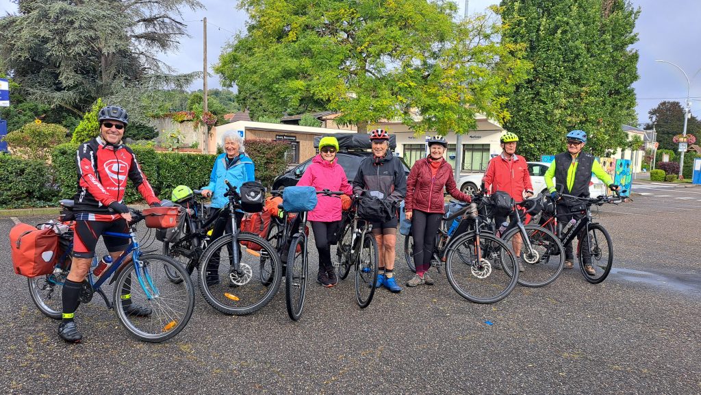 Départ sous un ciel menaçant à 9:00, les capes de pluie ont été vite dégainées. Passage de la frontière à Neuenburg am Rhein. Premiers tours de roue humides mais motivés.