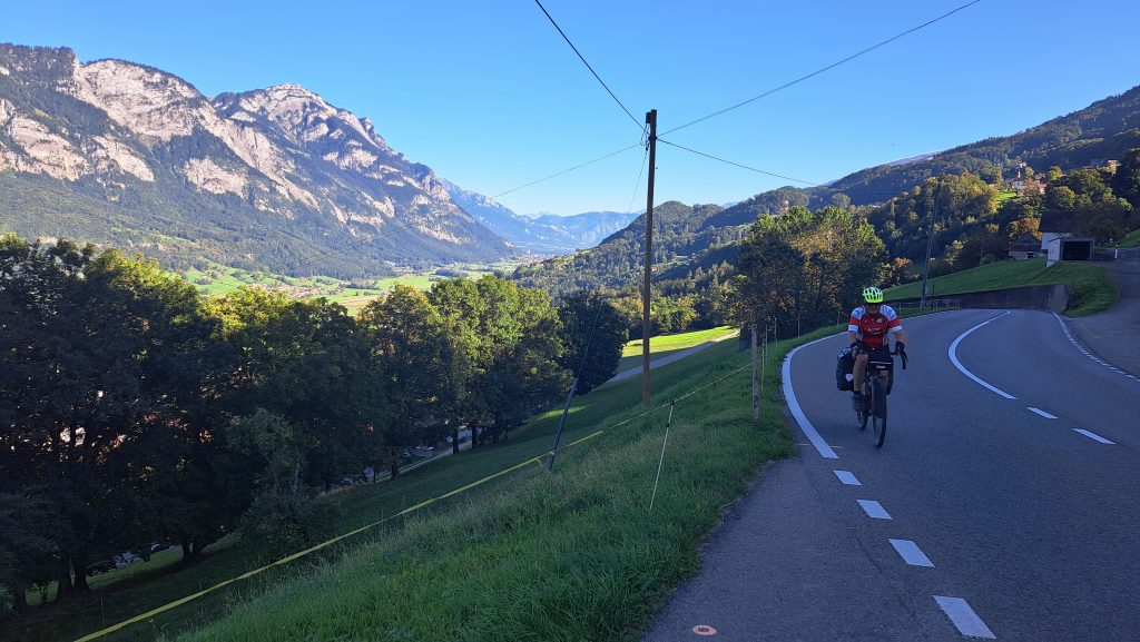 Remontée du Rhin côté Liechtenstein, puis ascension du Flumsenberg avec 6 km à 10%…une arrivée d’étape du tour de Suisse: dur dur, avec les sacoches, même avec une assistance électrique.