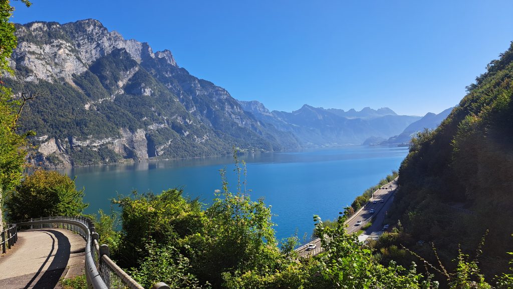 Flum vers Walenstadt, le long du lac Walensee. Une piste cyclable spectaculaire à travers des tunnels et des passerelles, bordées de falaises et d’eau turquoise en direction de Zürich: une traversée épique avec beaucoup de circulation, mais une belle piste le long du lac et une arrivée à Spreitenbach.